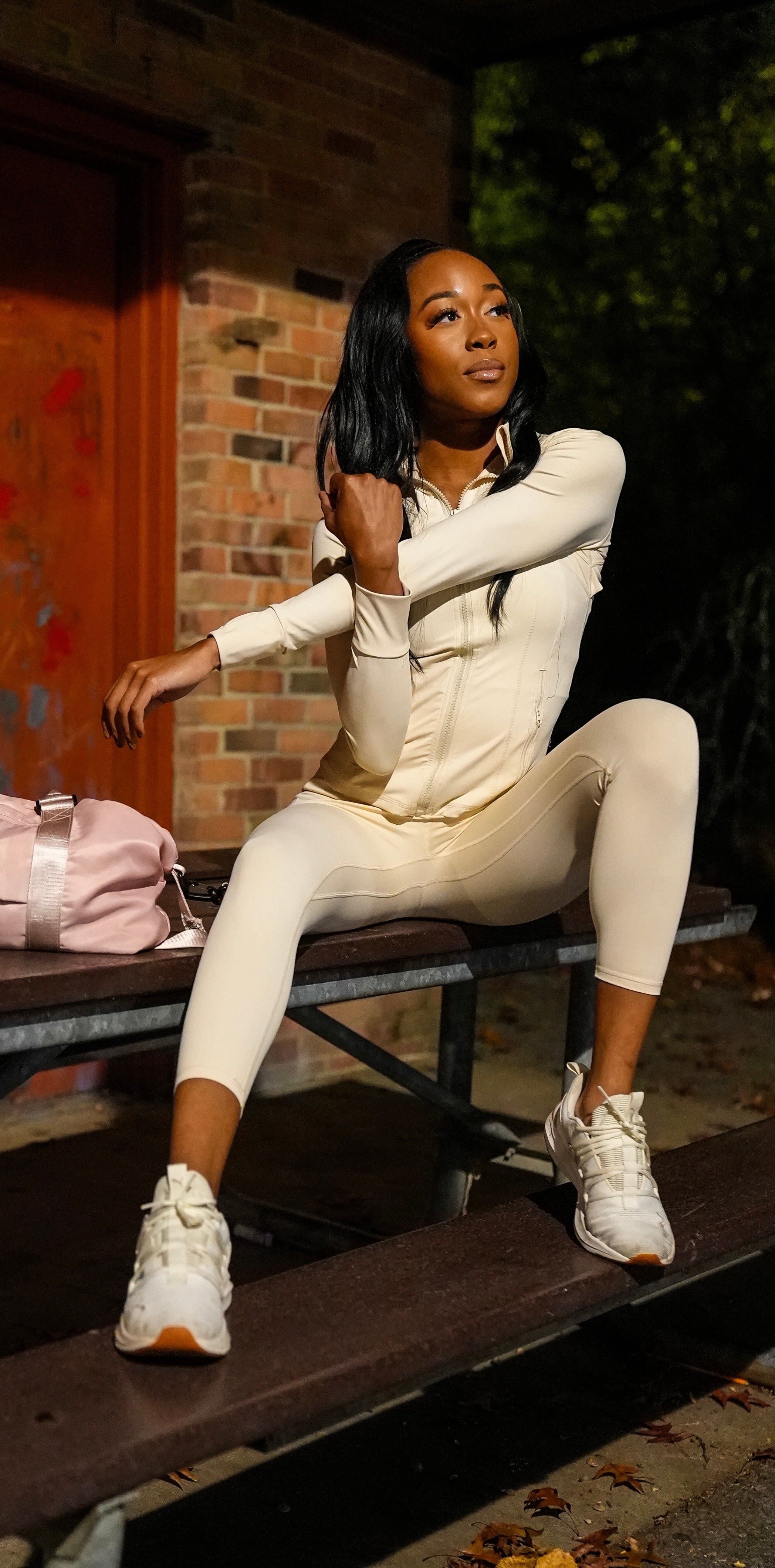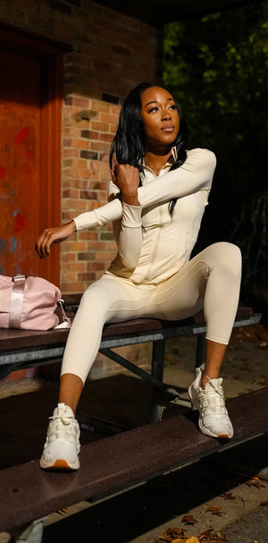 TWO-PIECE FITTED STRETCHY LONG SLEEVE JACKET WITH POCKETS AND CAPRI PANTS SET