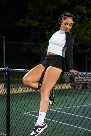 TWO-PIECE FITTED STRETCH LONG SLEEVE SHIRT AND LOW SHORTS WITH PULL OVER SET