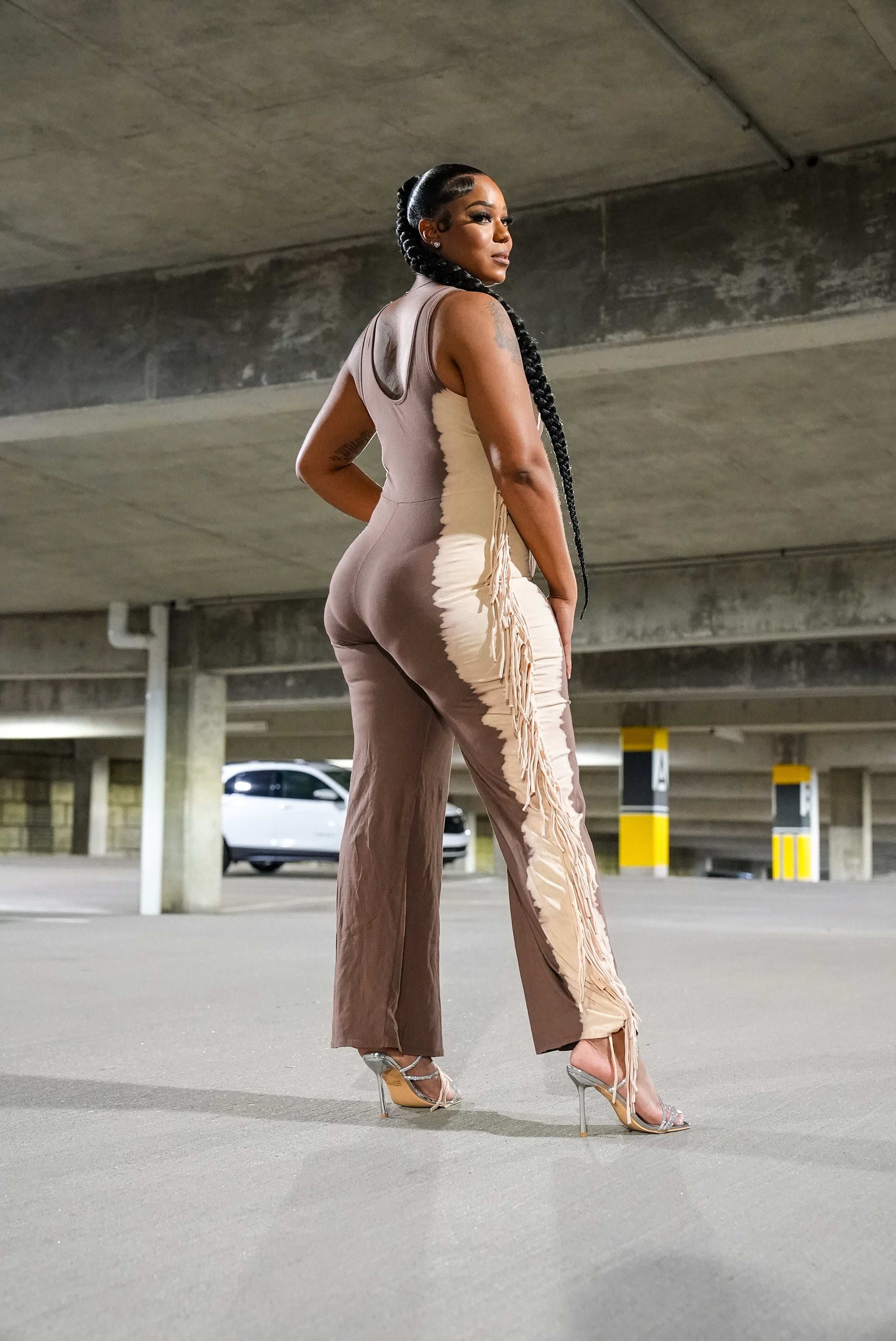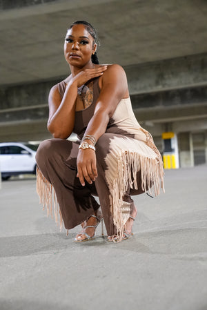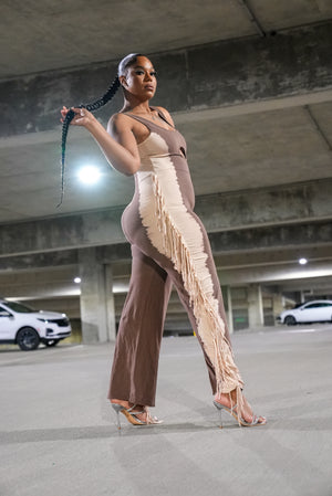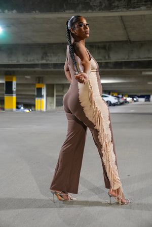 ONE-PIECE STRETCHY JUMPSUIT WITH FRINGE ON SIDES AND SMALL CUT OUT IN FRONT