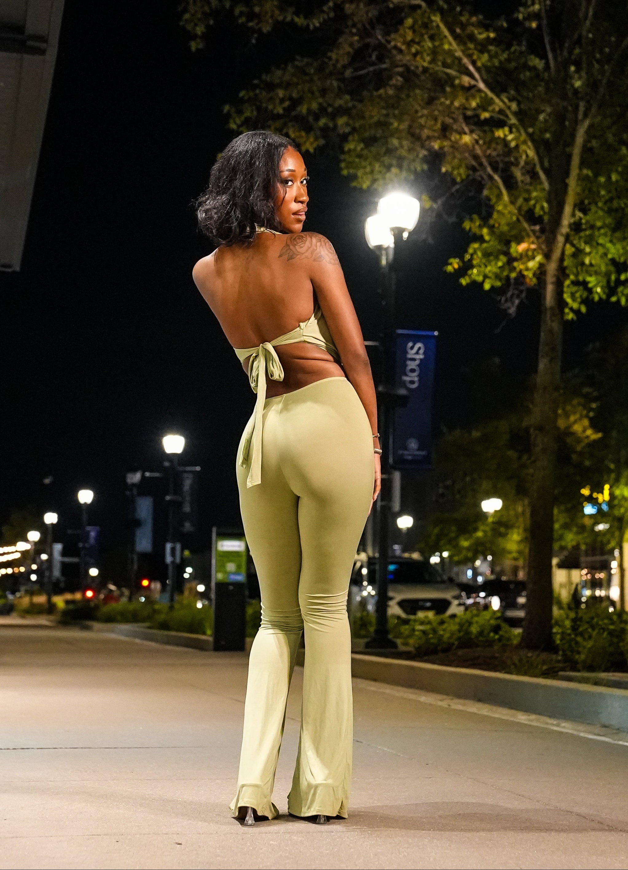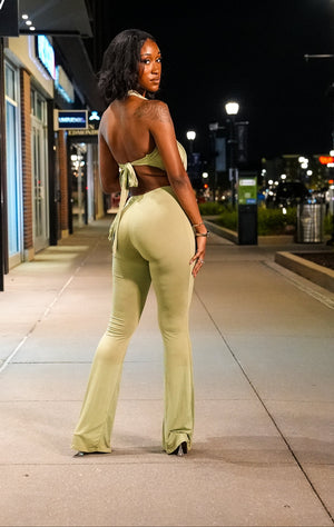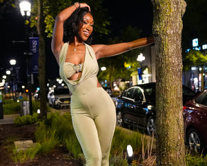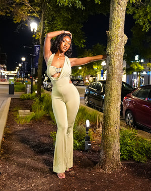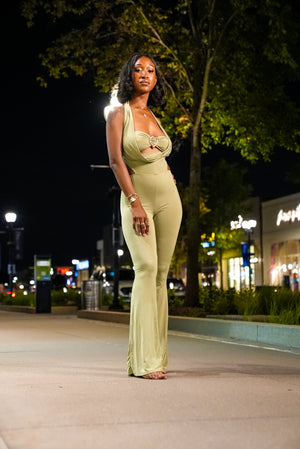 ONE-PIECE OVER HEAD STRETCHY LONG JUMPSUIT WITH GOLD HEART IN CENTER AND OVAL HANG IN FRONT